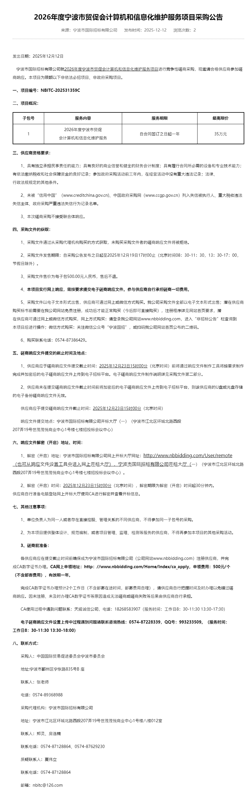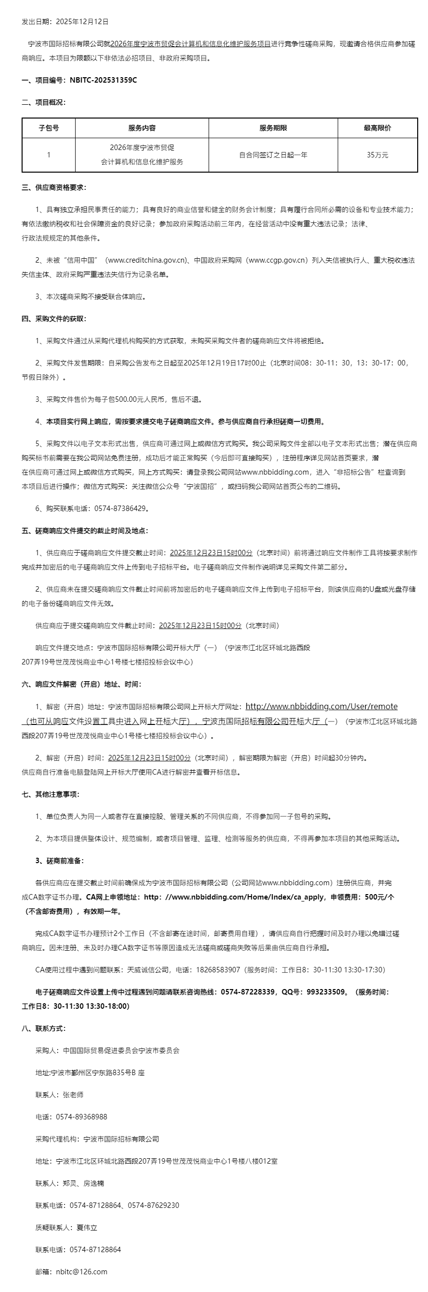 2026年度寧波市貿促會計算機和信息化維護服務項目采購公告