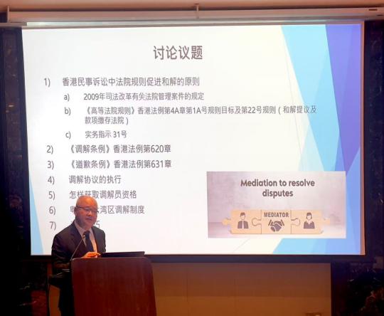 香港Liberty Chambers大律師事務所大律師馬耀添在“香港特別行政區的調解制度在民事訴訟中的角色與調解技巧”專題分享中,從香港《高等法院規則》《調解條例》《道歉條例》等相關規定出發,系統介紹了調解制度在香港民事訴訟中的角色;并結合個人從業經歷,分享了香港促進式調解的經驗技巧。